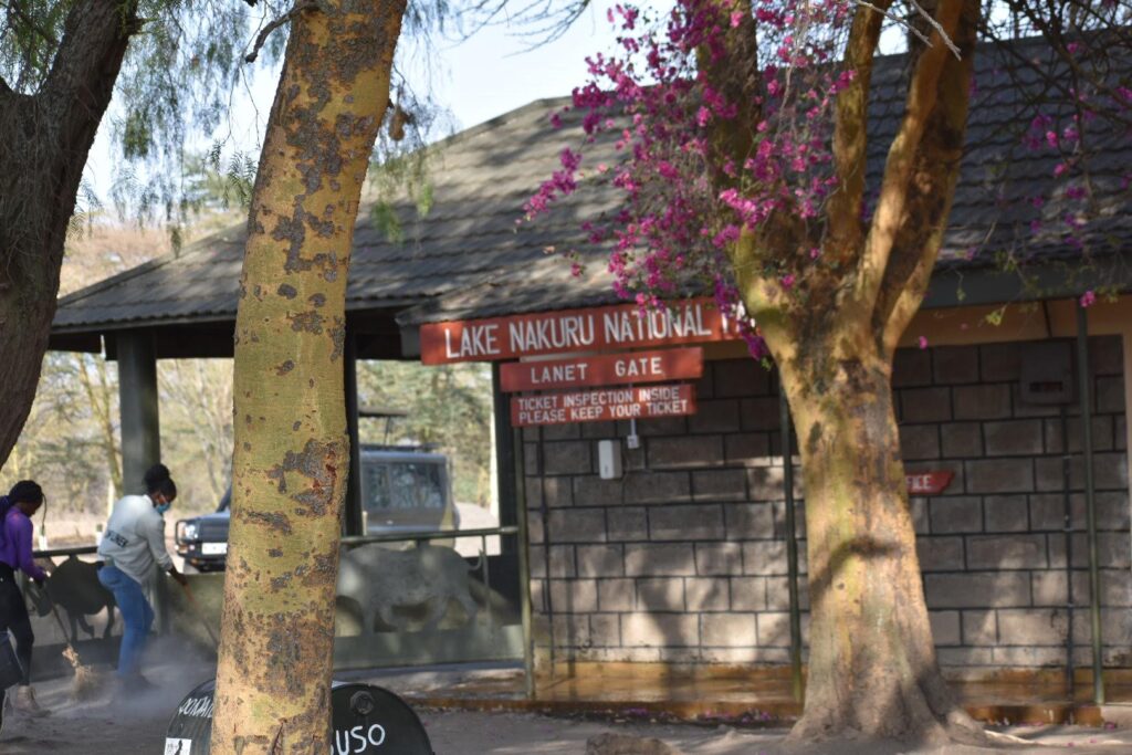 By about 8:00am we were in the thick of Nakuru traffic, probably people headed to work. David turned left off the highway down a bumpy side road and drove toward the lake. Soon we were at the Lanet gate of the park where we stopped to allow the rangers to check our permit for the day. David went to negotiate the formalities and I hopped off the 4×4 to chat with a lady seated at the gate toting a very impressive looking weapon – it looked like an AK 47 or something of that nature. I hailed her with a “Jambo!” and she responded in kind. Despite the intimidating hardware, she was super nice, and we talked a little bit – asking where we were from. She told me that she was from the Kamba tribe, like David. We chit-chatted a little more and she told me that the weaponry was mainly to deal with poachers, hardly a problem anymore. Soon permits checked, David came out of the office beside the gate; so, she and I said our goodbyes. As it turned out, David knew her from prior trips to Nakuru and they exchanged some pleasantries in Swahili before we entered the park.