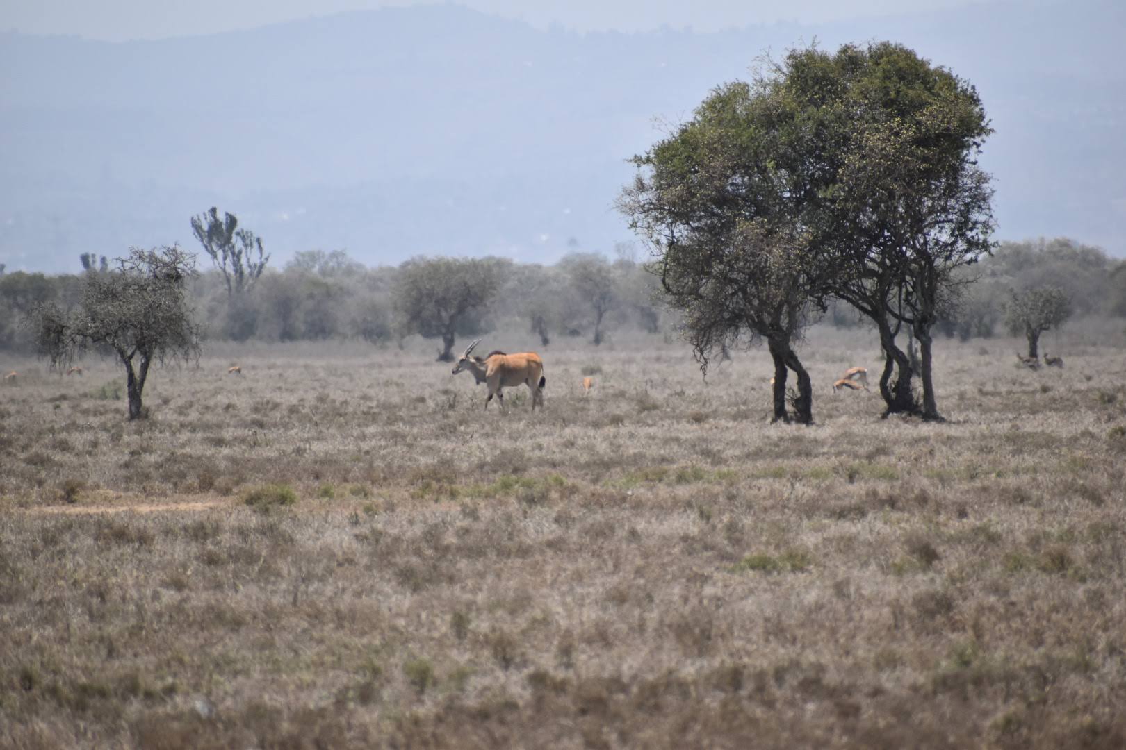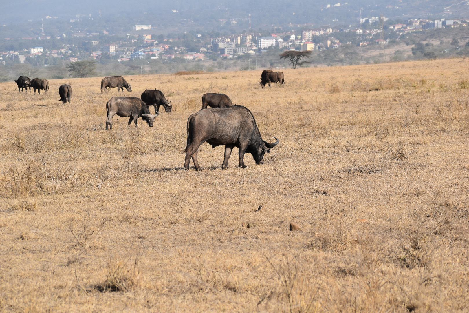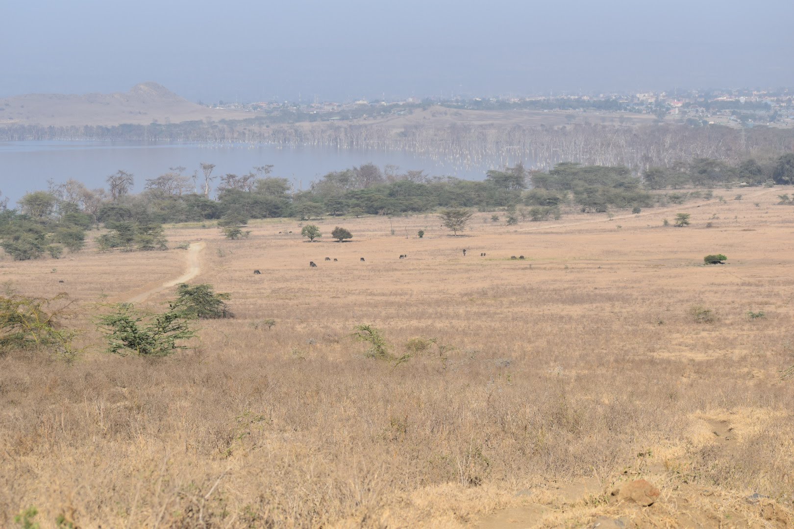 We drove down your typical unpaved dirt track and then crested a rise from which we finally had a panoramic view of the park with the lake in the background. The grass was brown and looked exceedingly dry, with the odd Acacia tree relieving the monotony. The lake was an inviting shade of blue. Some buffalo grazed out in the distance. Strangest in my mind was the sight of the city in the background – only in Kenya have I seen such a juxtaposition of a large urban center with a wildlife park (Lake Nakuru wasn’t an exception either; Nairobi has the same set-up). My sister said that of Guindy National Park in Chennai, India. I suspect that it is not as uncommon as I make it sound!