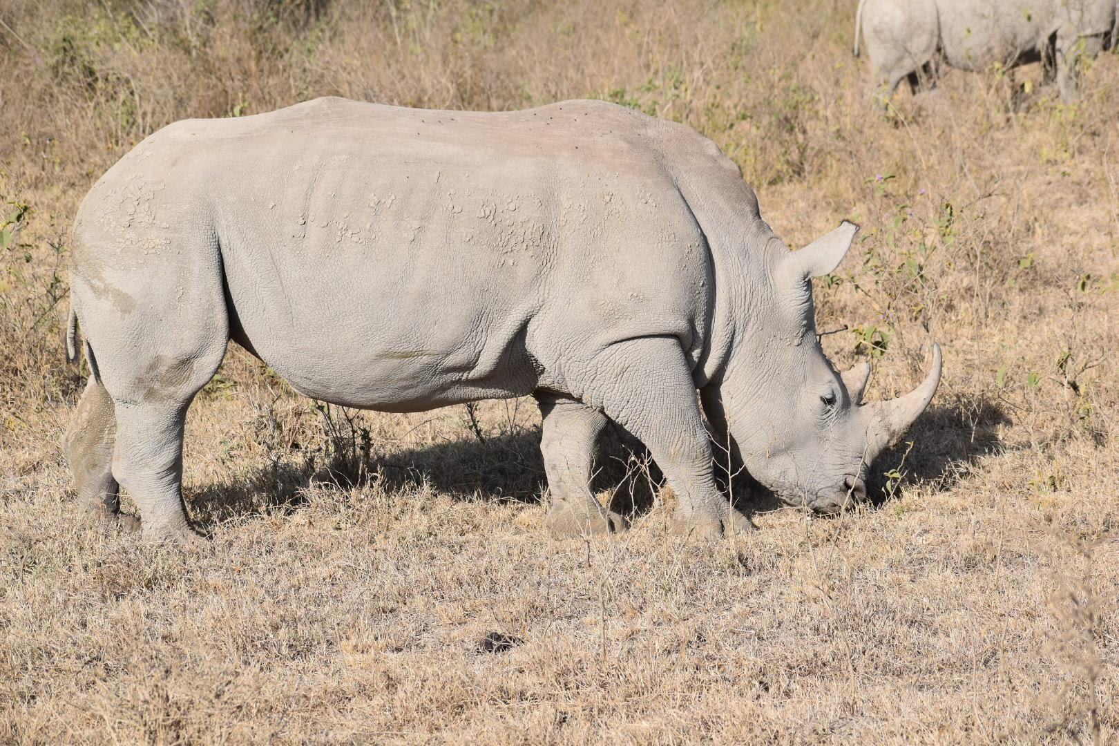 David drove the Toyota Landcruiser further into the park. Soon we were on relatively flat land, in contrast to the undulating terrain when we entered the park. The left side of the vehicle was lightly wooded about 200 yards away with grassland closer to the track, while the starboard side was dry grassland. David stopped and said, “Southern White Rhino!”. Our necks swiveled to where he was looking, toward port and we saw a pair of grey Rhino. (As we learned later, just about every Rhino is grey despite the names – the Black Rhino common in Kenya (critically endangered) is the same coloration. However, they are distinguished by their upper lip – a black rhino has a pointed lip, while white rhinos are adorned with a squarish lip. Black rhinos are far more aggressive while, paradoxically, being very shy and hard to approach. David told us that there were plenty of cases where a black rhino charged a vehicle!)
