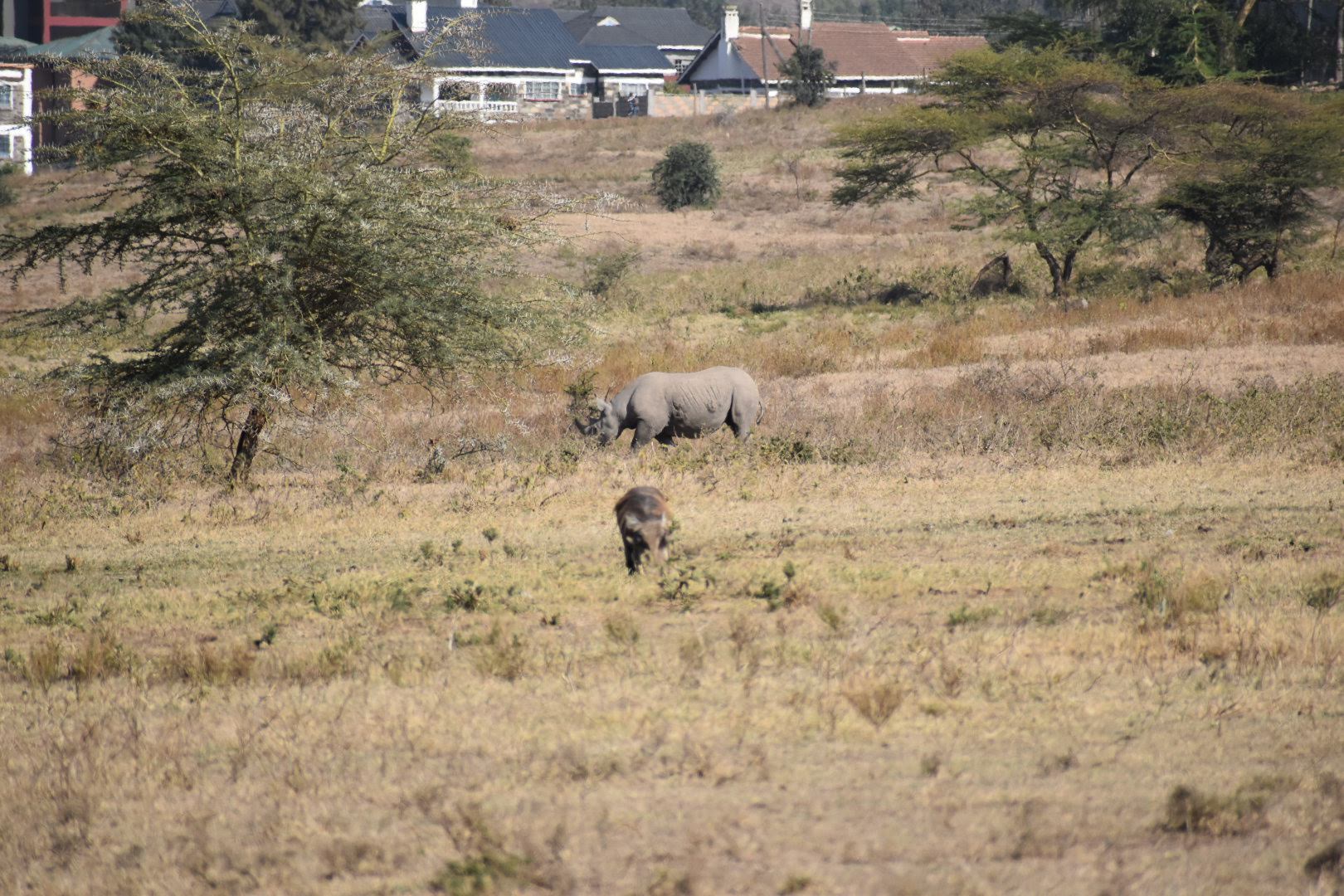 I got some good photos of the rhinos while we were stopped for about 10 minutes. We then set off again and spotted a Pumba (warthog) digging up its morning meal. David has phenomenal eyesight and a moment later he said Black Rhino out to our 2 o’clock. We looked and couldn’t see anything and said as much. He said, “look out at the tree line towards the fence of the park”, and sure enough, out almost a mile away we could see what looked to us like a rhino! David drove us a little closer (maybe a half mile away) and told us that if we drove any closer, it would get alarmed and move away. Thanks to my trusty 75-300mm telephoto lens, I finally managed to capture a few passable images. It was surreal to see a rhino with a backdrop of buildings!