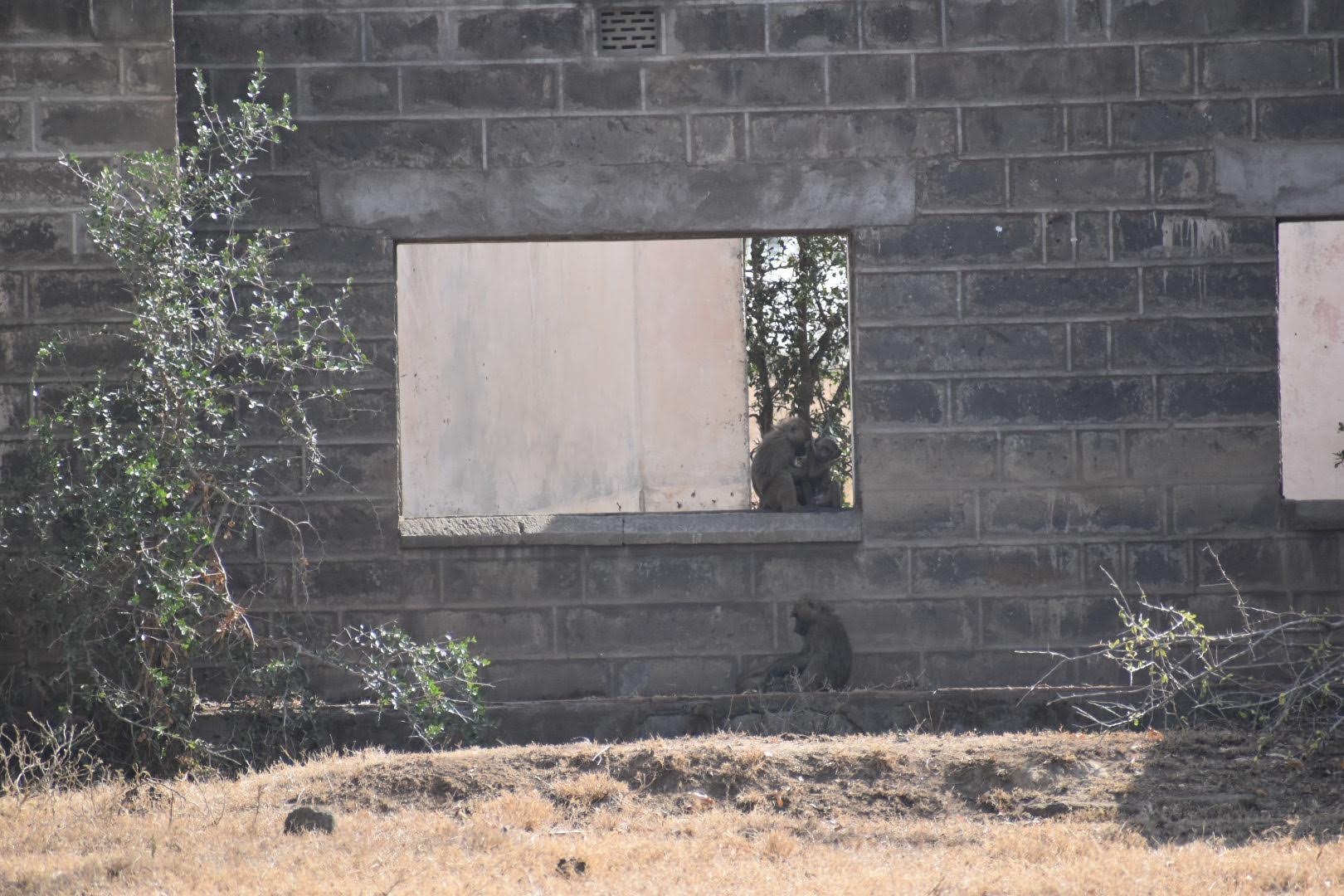 We moved on and soon we saw a herd of Buffalo. We then pulled up close to an abandoned set of buildings within the park with a few trees around these. There we saw a troop of Baboons, some scrabbling for food (probably insects) on the arid ground while others groomed each other on a window ledge.