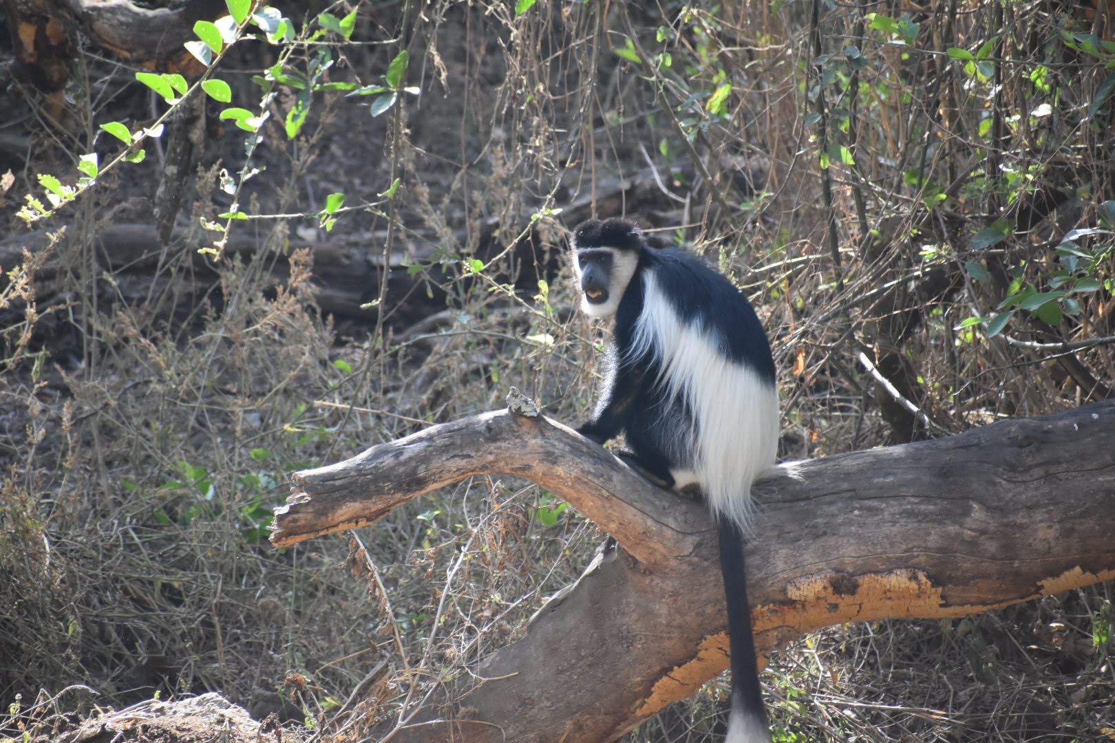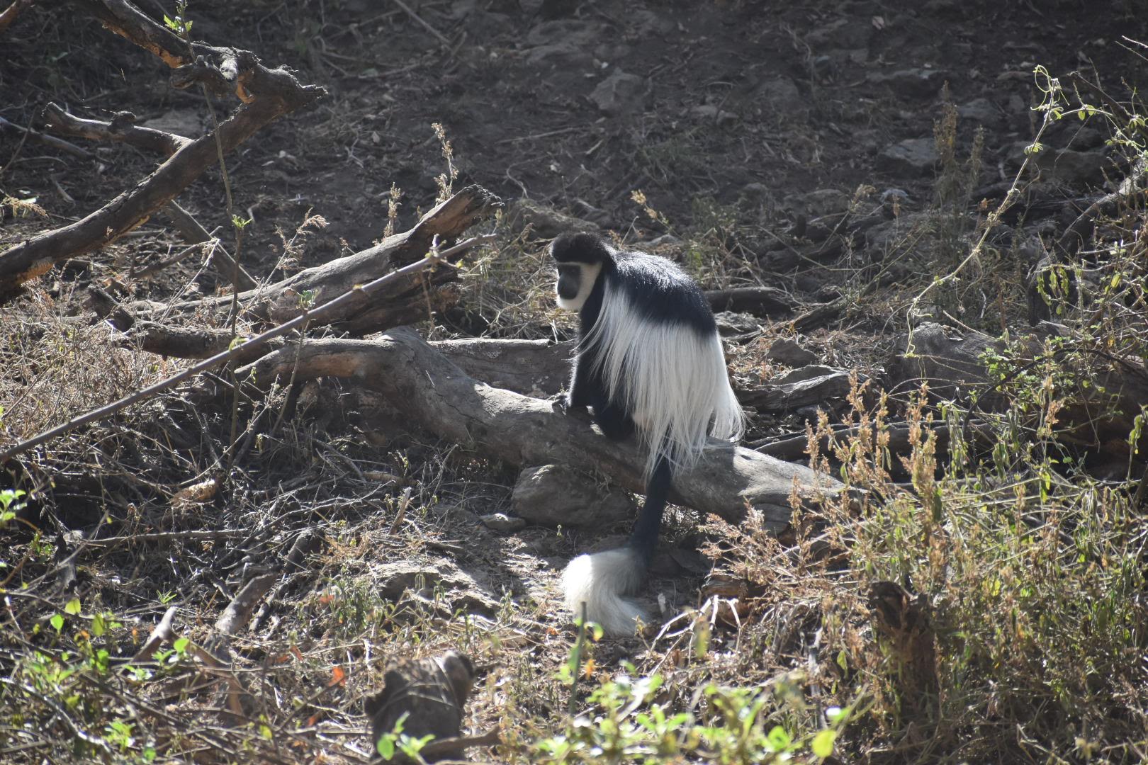 As we drove on, this time toward a hill bordering the eastern end of the park, we saw plenty of Zebra, then more Buffalo. David then stopped suddenly and said, “Colobus Monkey!”. We watched as a pair of these monkeys (we had never seen anything quite like it) hopped down from a tree branch and then moved in leisurely fashion up the hill on a dry stream bed.