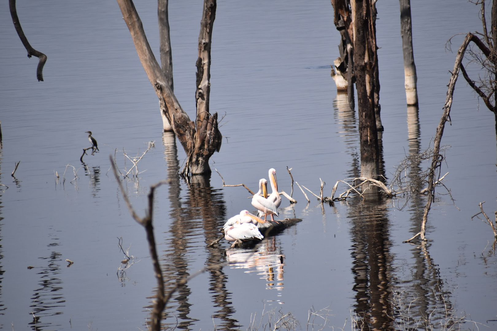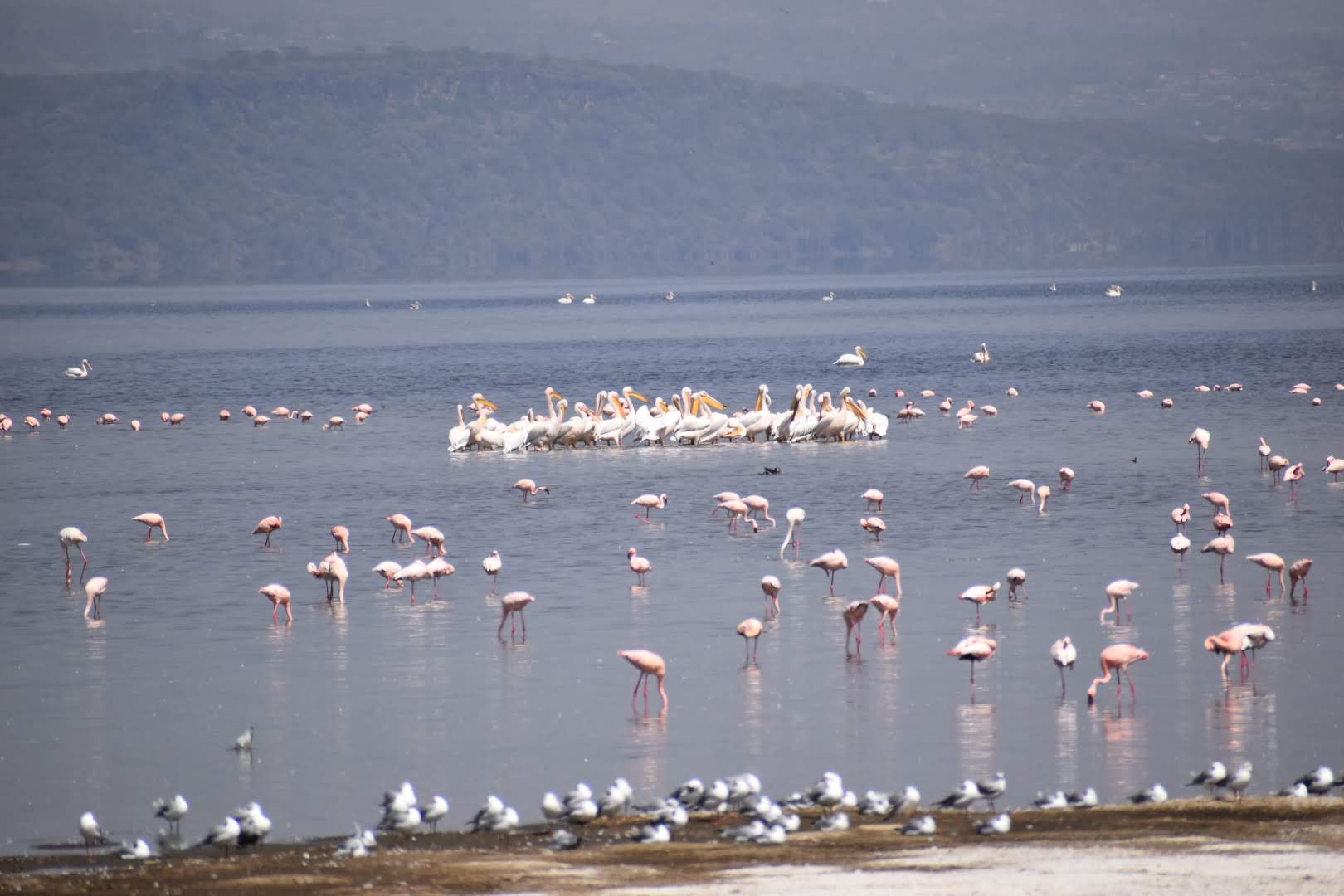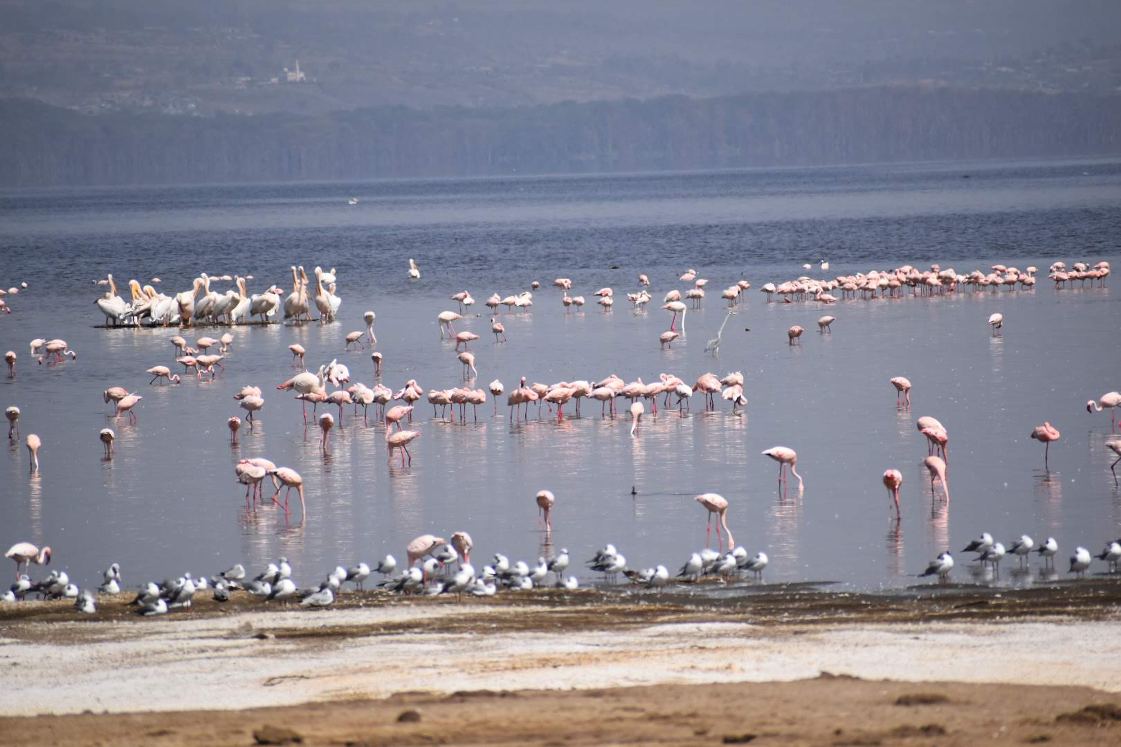 After a few minutes, we approached the southern tip of the lake where we crossed a bridge. There we happened upon a flock of colorful Flamingos. David told us that there used to be millions of these beautiful birds on Lake Nakuru but that the numbers had diminished significantly, in part due to pollution from industries that dumped wastewater in the lake and in part due to changes in the soil that then absorbed less rainwater, causing periodic flooding and consequent reduction in the algae on which the birds fed. We felt saddened that we would not be able to see the gigantic flocks of flamingo for which Lake Nakuru was justly famous. There was a flat mud bank to the lake right after the bridge and David drove onto that. We were able to hop off the vehicle and I took advantage of that to photograph the flamingos and other birds: the Little Grebe, some Pelicans, a Marabou stork, gulls, a pair of Egyptian Geese with a Black-winged Stilt and a Yellow-billed Stork with a Marabou.