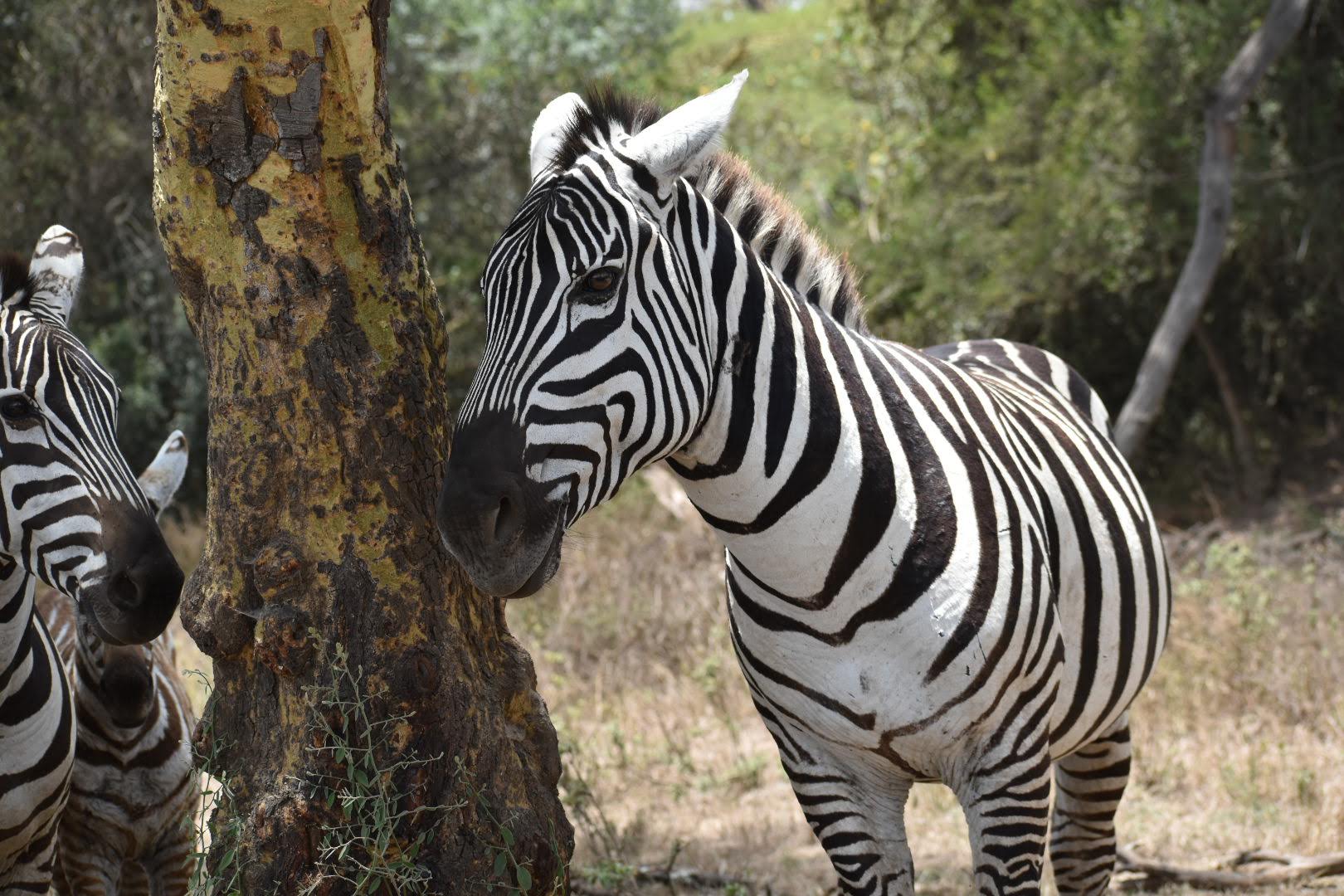 We spent about a half hour at this idyllic spot on the southern shore of the lake. By then it was just past 11:00am and the sun, high-up in the sky, was beating down on us. We decided to set off for the more wooded parts of the park. David put the Toyota into gear and soon we were back on the dirt track that led further south and away from the lake. Shortly thereafter we spotted our first Giraffe. David stopped and, while I was taking pictures, told us that this was a Rothschild Giraffe, a third species of Giraffe in Kenya, the others being the Masai Giraffe that we had seen in Amboseli, and the Reticulated Giraffe we had seen north of the equator at Samburu. We learned that these were distinguished by being taller and paler than the Masai Giraffe. We then spotted a beautiful Black-headed Heron followed by the first Eland I had seen. David told us that these large antelope can grow to be even heavier than a Buffalo that weighs in at close to 1800 pounds! Just after noon, we pulled up by a tree encircled by three Zebra, one of which scratched its side vigorously against the trunk. They were about 4 feet from the side of our vehicle and were quite unalarmed by our proximity.