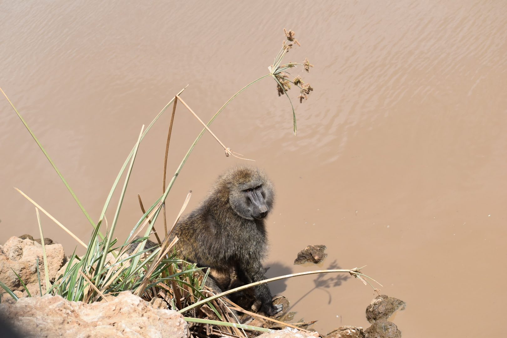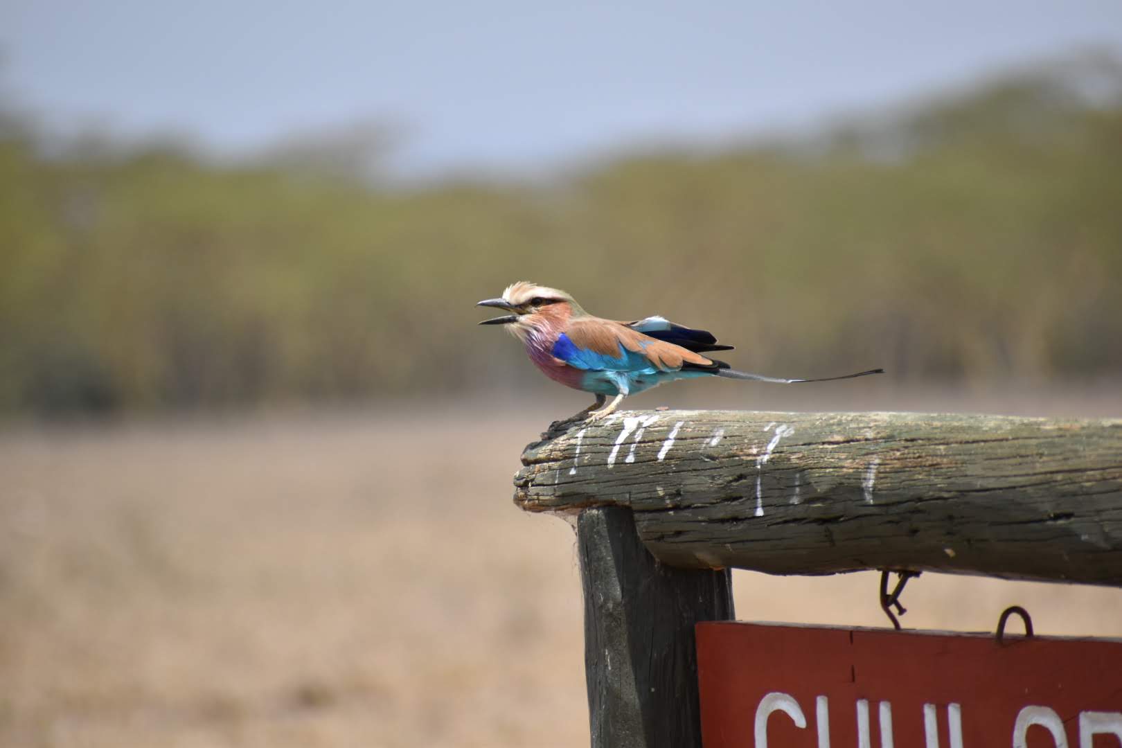 With our lunch complete and an apple for dessert, we got back in the Toyota and headed north again towards the lake. (By the way, I should mention that this Landcruiser is a fully covered vehicle and highway capable. But, for the time we spent in the park, David pushed the top open so that there was a good 3 feet or so where we could stand and view the wildlife without impediment.) As we passed the airstrip, I spotted a lilac breasted roller on a sign and was able to capture a few images. A little further on we saw a lone baby giraffe. It had apparently been separated from its mom but looked quite unconcerned. David told us that the Giraffe mom would (likely) eventually find the baby by using its height to look around and that mom and baby never strayed too far from each other. Soon we drove over the little bridge at the southern end of the lake and saw a troop of baboons. Most of the baboons scattered when they saw us coming except for the alpha male who looked at us without fear from 15 feet.